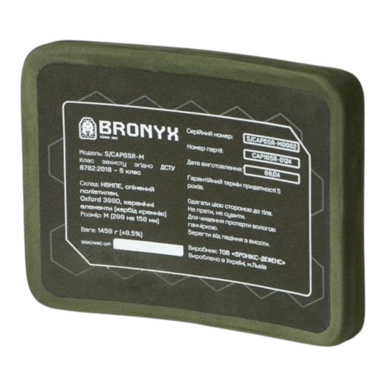 Бронеплита бокового захисту BRONYX 6 класу — це жорстка бронеплита для додаткового захисту бокових зон тулуба. Виготовлена з поєднання карбіду кремнію (SiC) та НВМПЕ, має розмір 21,5×16 см, вагу 1,44 кг і товщину 27 мм. Відповідає 6 класу захисту згідно ДСТУ 8782:2018, забезпечує високий рівень балістичної стійкості та призначена для встановлення у бокові кишені бронежилета або плитоноски.