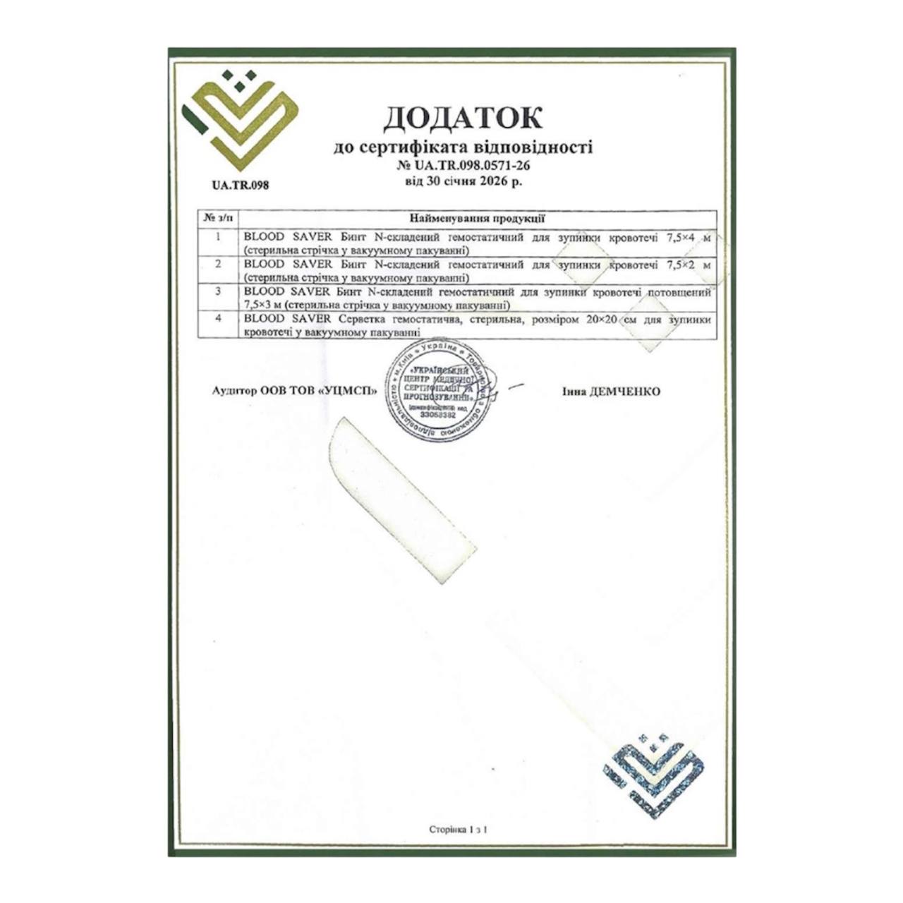 Гемостатичний бинт BloodSaver 7,5 см × 4 м — стерильний медичний засіб для швидкої зупинки кровотечі при травмах, пораненнях та інших критичних ситуаціях. Бинт просочений спеціальною гемостатичною композицією на основі каоліну, яка прискорює згортання крові та сприяє формуванню стабільного кров’яного згустку.