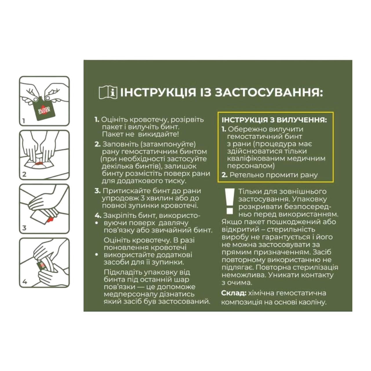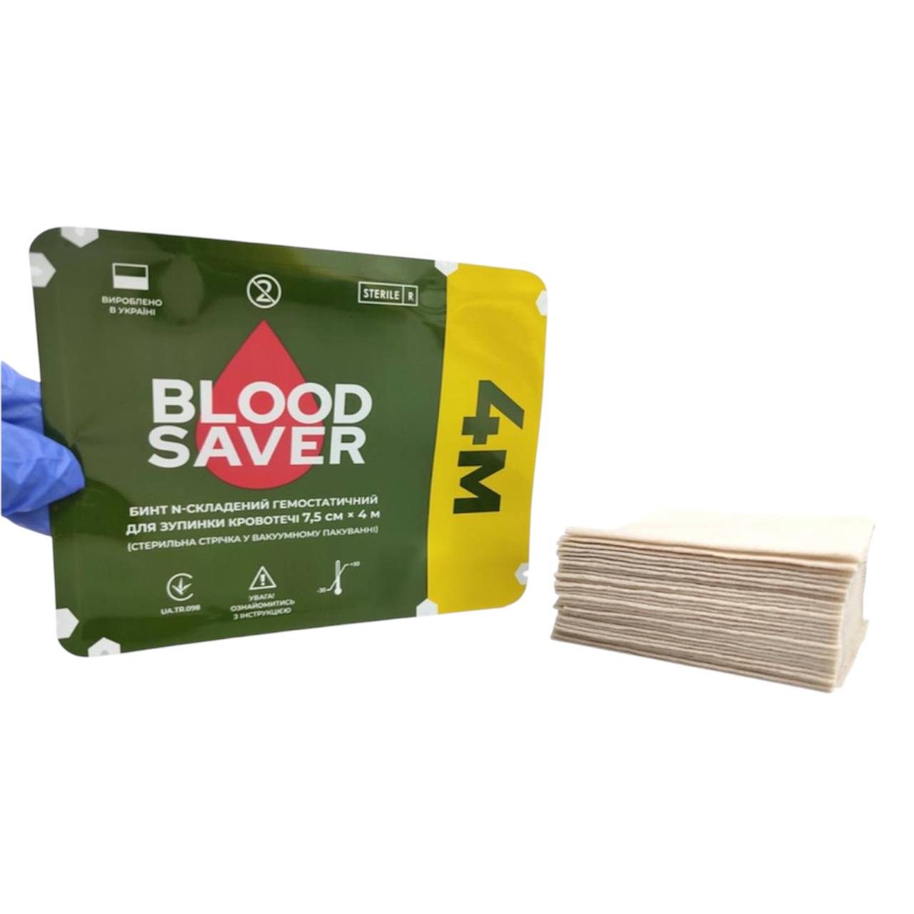 Гемостатичний бинт BloodSaver 7,5 × 4 м — стерильний медичний засіб для швидкої зупинки кровотечі. Просочений гемостатичною формулою на основі каоліну, що прискорює згортання крові та допомагає стабілізувати стан постраждалого. Підходить для військових аптечок та індивідуальних аптечок першої допомоги.
