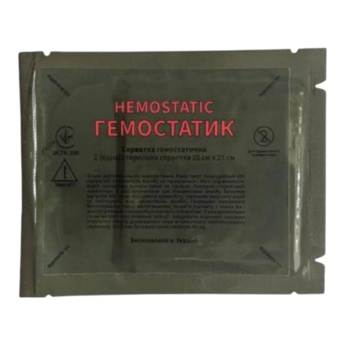 Гемостатична серветка «Гемостатик» 25 × 25 см — стерильний засіб для швидкої зупинки кровотечі. Підходить для військових аптечок, аптечок першої допомоги та екстреної медицини.