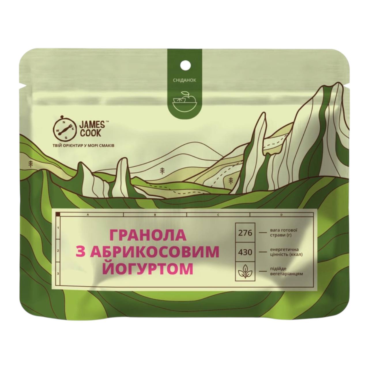 Гранола з абрикосовим йогуртом James Cook — поживний сублімований сніданок для походів і подорожей. Достатньо залити гарячою водою і через 2 хвилини отримати 276 г готової страви.