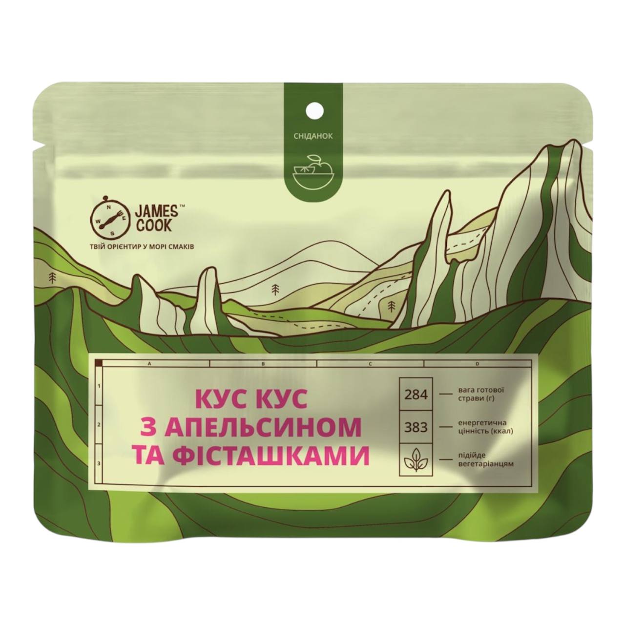 Кус-кус з апельсином та фісташками James Cook — це поживний солодкий сніданок, створений для активних людей, туристів і мандрівників. Поєднання кус-кусу, апельсина, фісташок, меду та сухого молока створює збалансовану страву з насиченим фруктово-горіховим смаком.