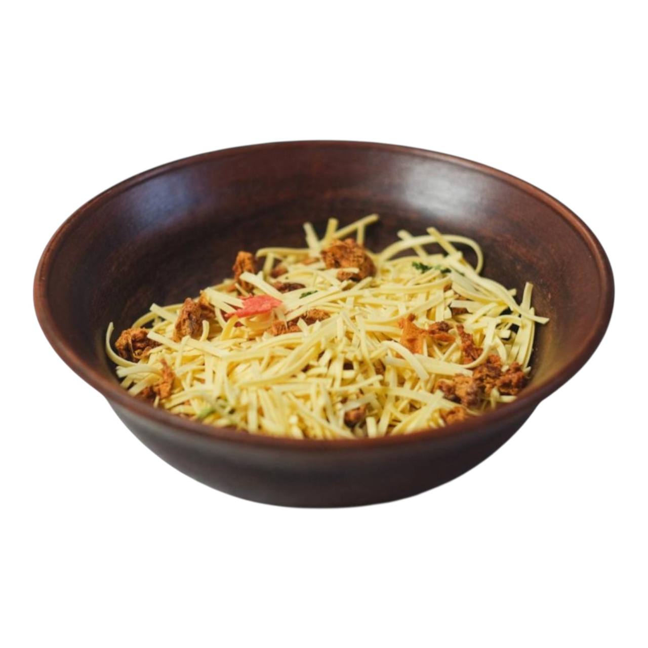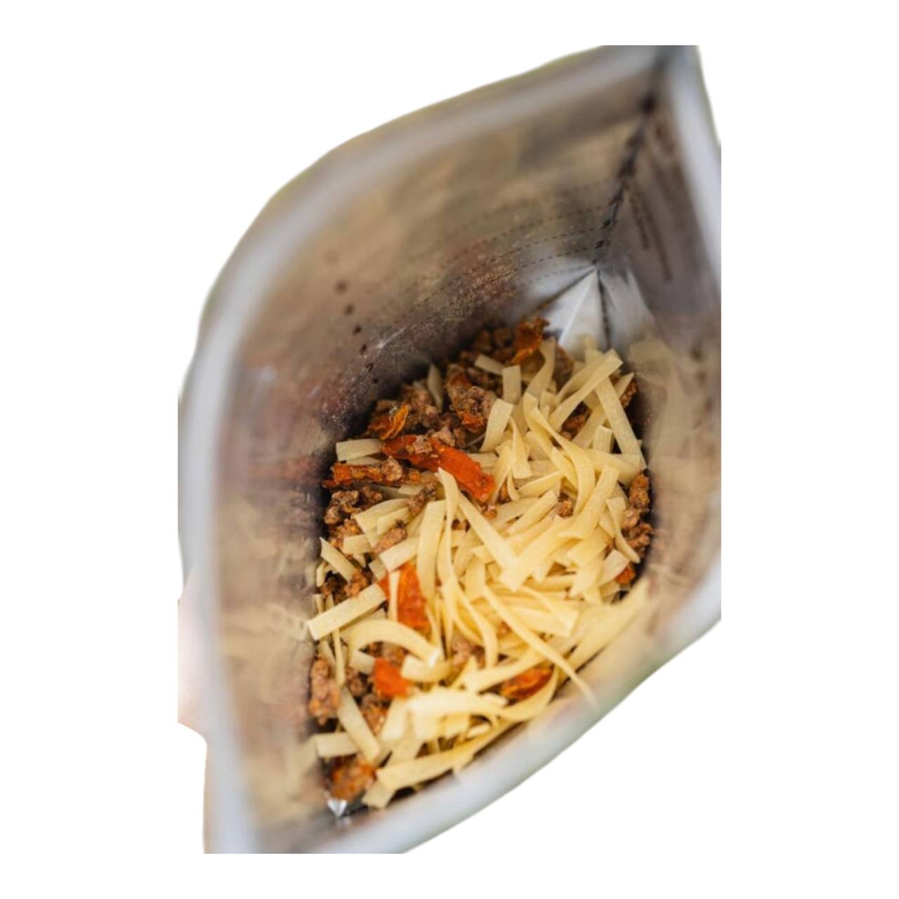 Класичний італійський соус Болоньєзе готується з двох видів м’яса — свинини та яловичини — з додаванням томатів, овочів і ароматних спецій. Завдяки технології сублімації страва зберігає природний смак і поживні властивості продуктів.