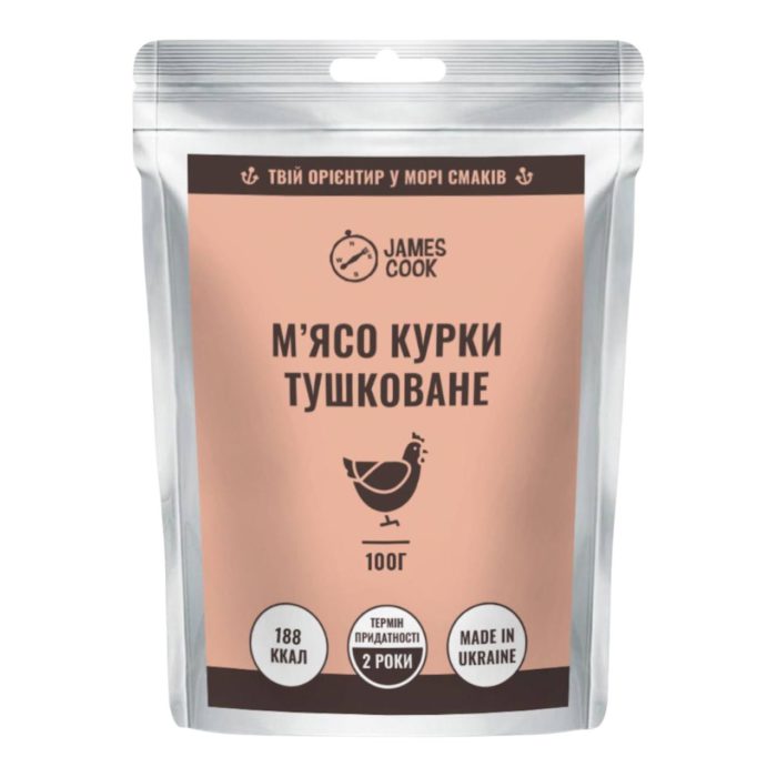 М’ясо курки тушковане у власному соку James Cook — поживна готова страва, яку можна вживати без приготування. Продукт виготовлений методом тушкування у автоклаві, що забезпечує безпечність, натуральний смак та тривалий термін зберігання.