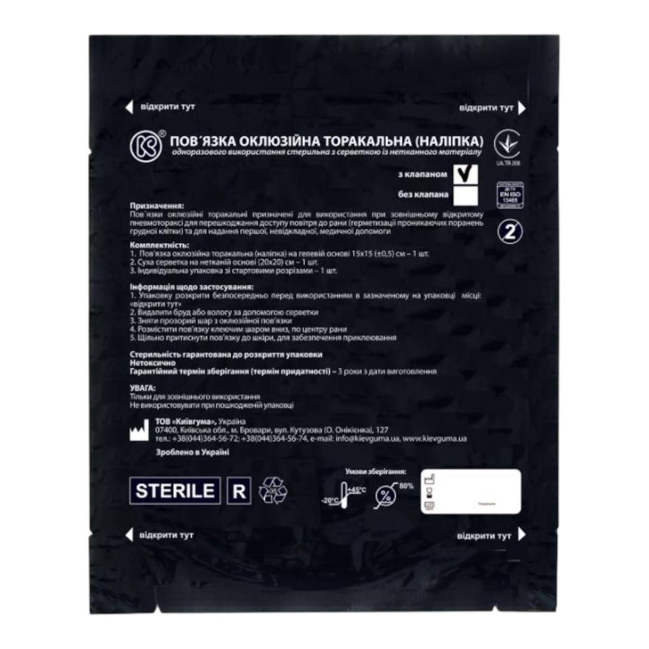 Оклюзійна грудна пов’язка з клапаном виробництва Київгума (Україна) призначена для надання першої допомоги при проникаючих пораненнях грудної клітини та відкритому пневмотораксі.