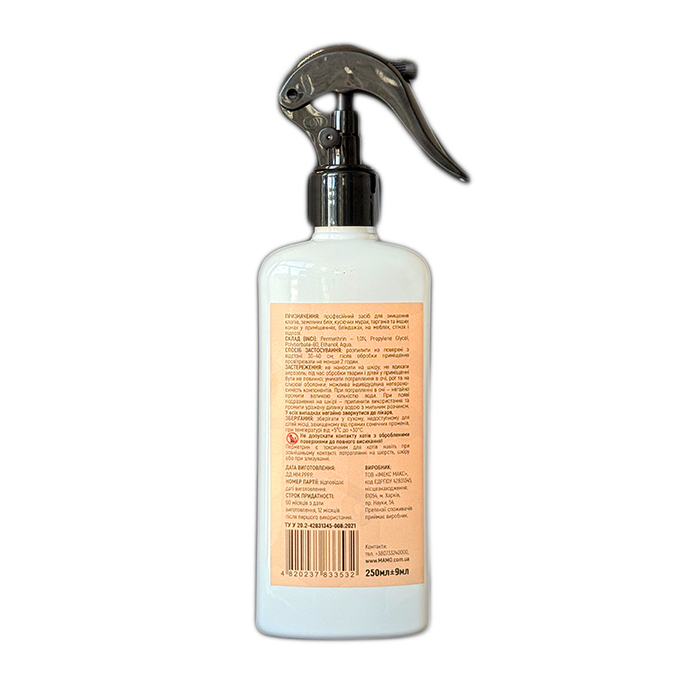 🔧 Спосіб застосування: Розпилити на поверхні з відстані 30–40 см до легкого зволоження. Після обробки провітрювати приміщення не менше 2 годин.