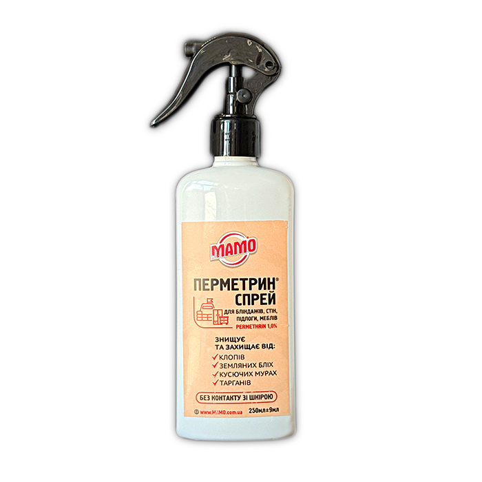 Перметрин-спрей 1,0% МАМО 250 мл — професійний засіб для бліндажів, меблів, підлоги та стін. Ефективно знищує клопів, земляних бліх, кусючих мурах, тарганів та інших комах. Призначений для використання у приміщеннях без контакту зі шкірою.
