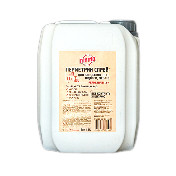 Перметрин-спрей 1,0% МАМО 5 л — професійний засіб для бліндажів, меблів, підлоги та стін. Ефективно знищує клопів, земляних бліх, кусючих мурах, тарганів та інших комах. Призначений для використання у приміщеннях без контакту зі шкірою.