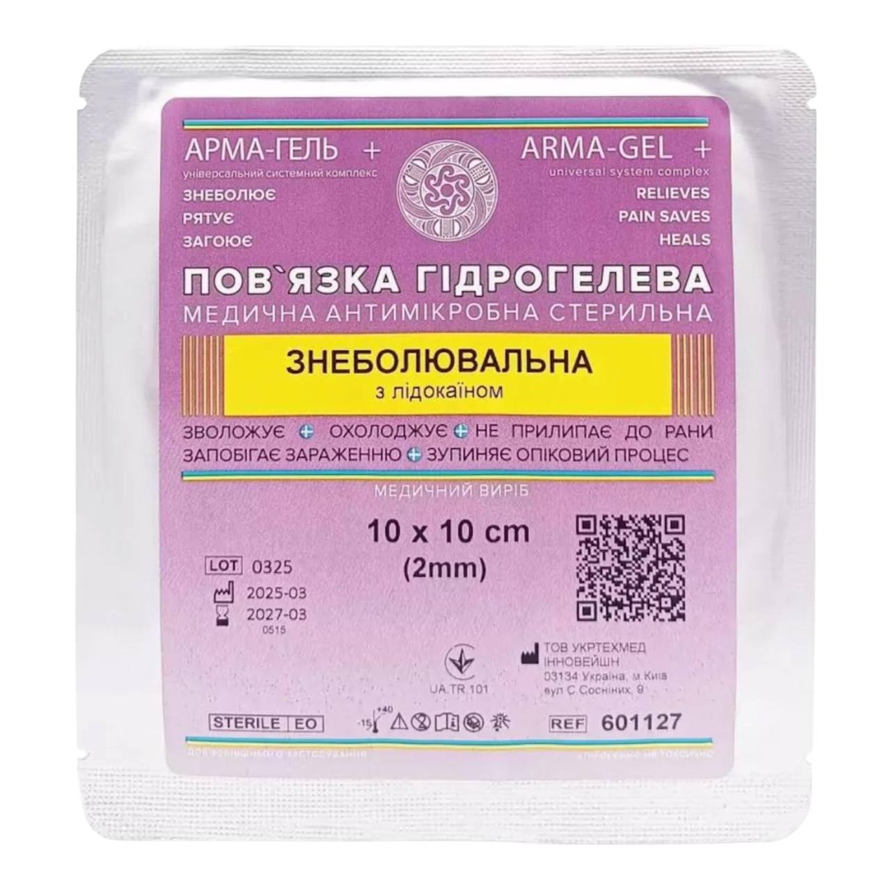 Пов’язка гідрогелева АРМА-ГЕЛЬ+ знеболювальна з лідокаїном 10×10 см армована сіткою