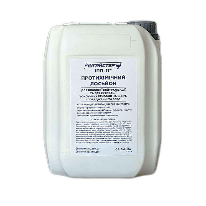 Протихімічний лосьйон ІПП-11 ЧУГАЙСТЕР™ (5 л) швидко нейтралізує бойові ОР, пестициди та токсичні промислові речовини на шкірі, спорядженні та зброї.