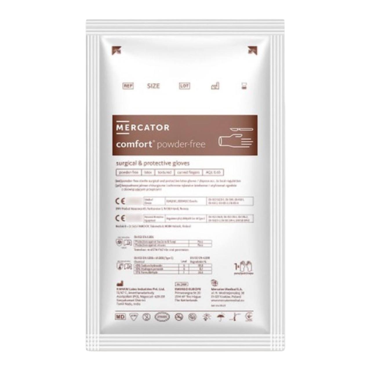 Mercator Comfort — стерильні хірургічні рукавички для загальних процедур, призначені для професійного використання в медицині, стоматології та хірургії. Модель виготовлена з натурального латексу, є неопудреною та має текстуровану поверхню, що допомагає забезпечити надійний хват і комфорт під час роботи. У характеристиках моделі зазначені медичний клас IIa, тип захисту III, метод стерилізації R, анатомічна форма та рівень щільності AQL 0,65.