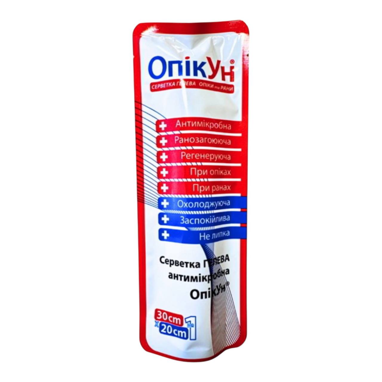 Гідрогелева антимікробна серветка «ОпікУн» 30×20 см — стерильна протиопікова пов’язка для надання першої допомоги при опіках, ранах та саднах. Охолоджує пошкоджену ділянку, зменшує біль, запобігає інфікуванню та прискорює загоєння.