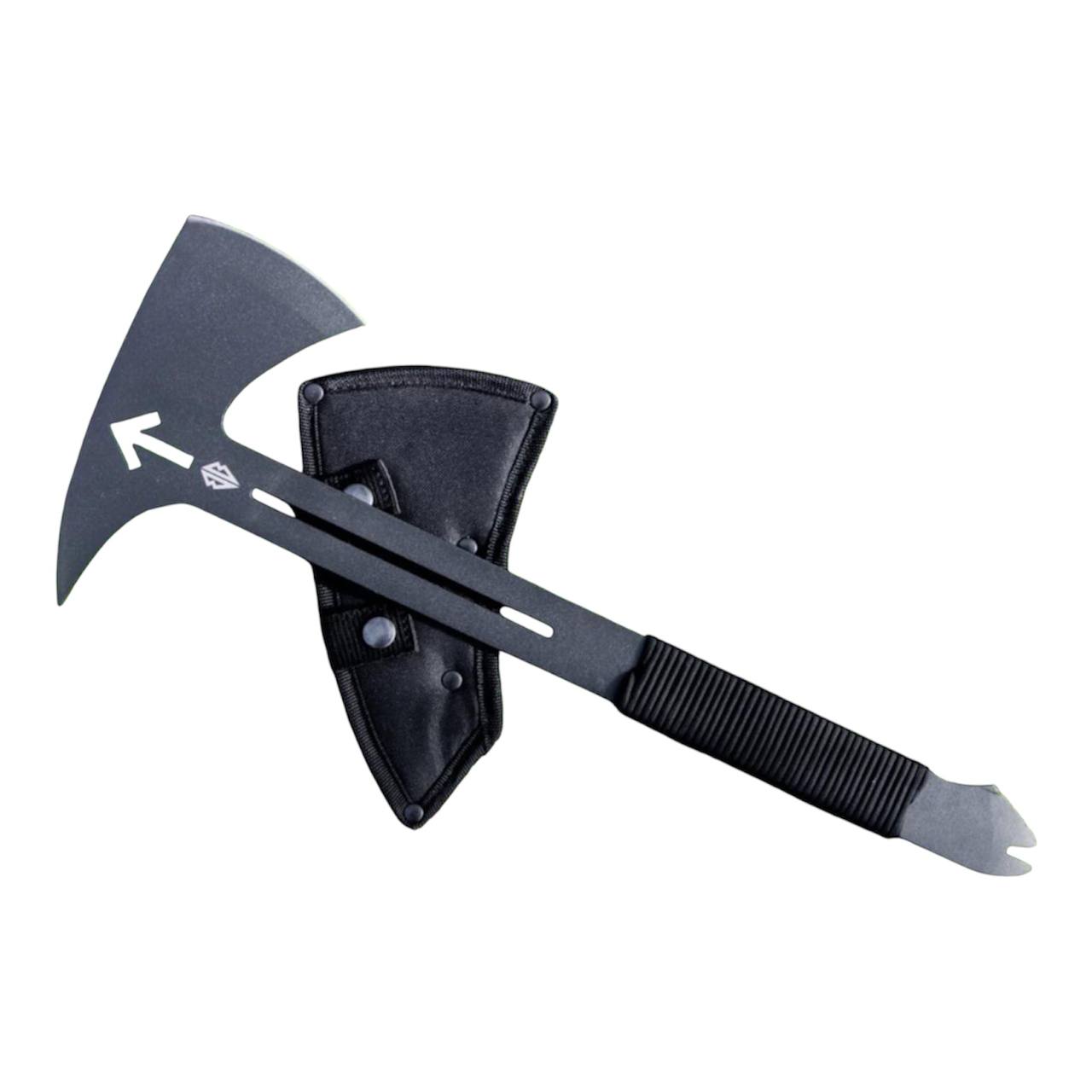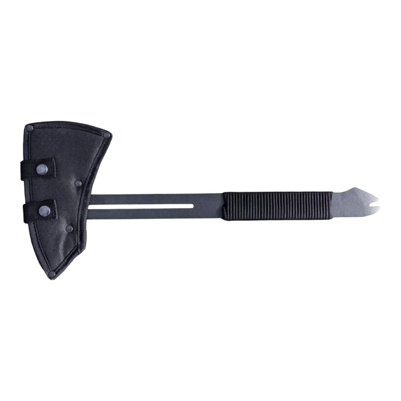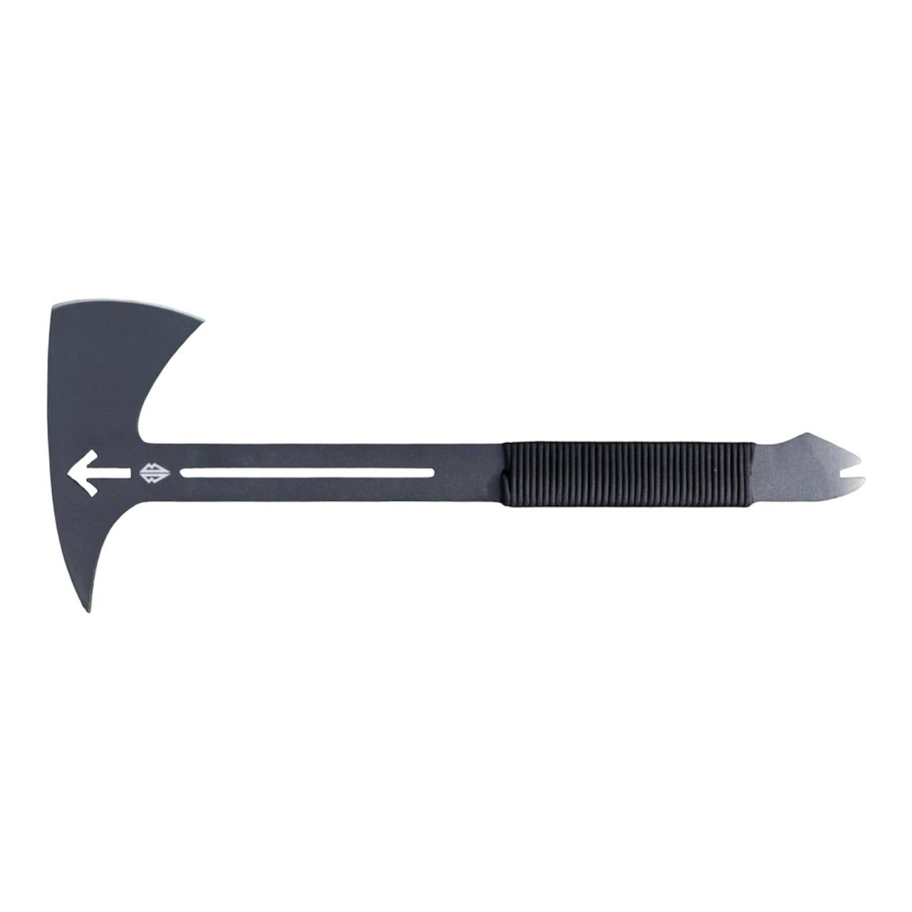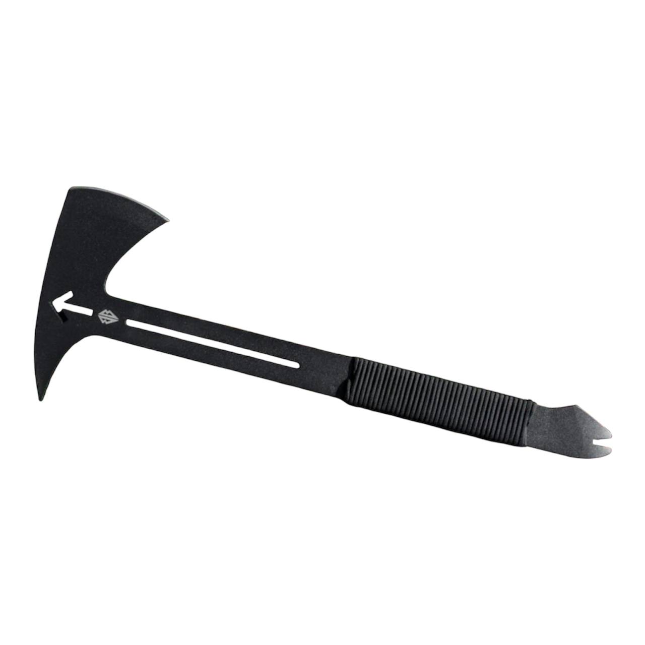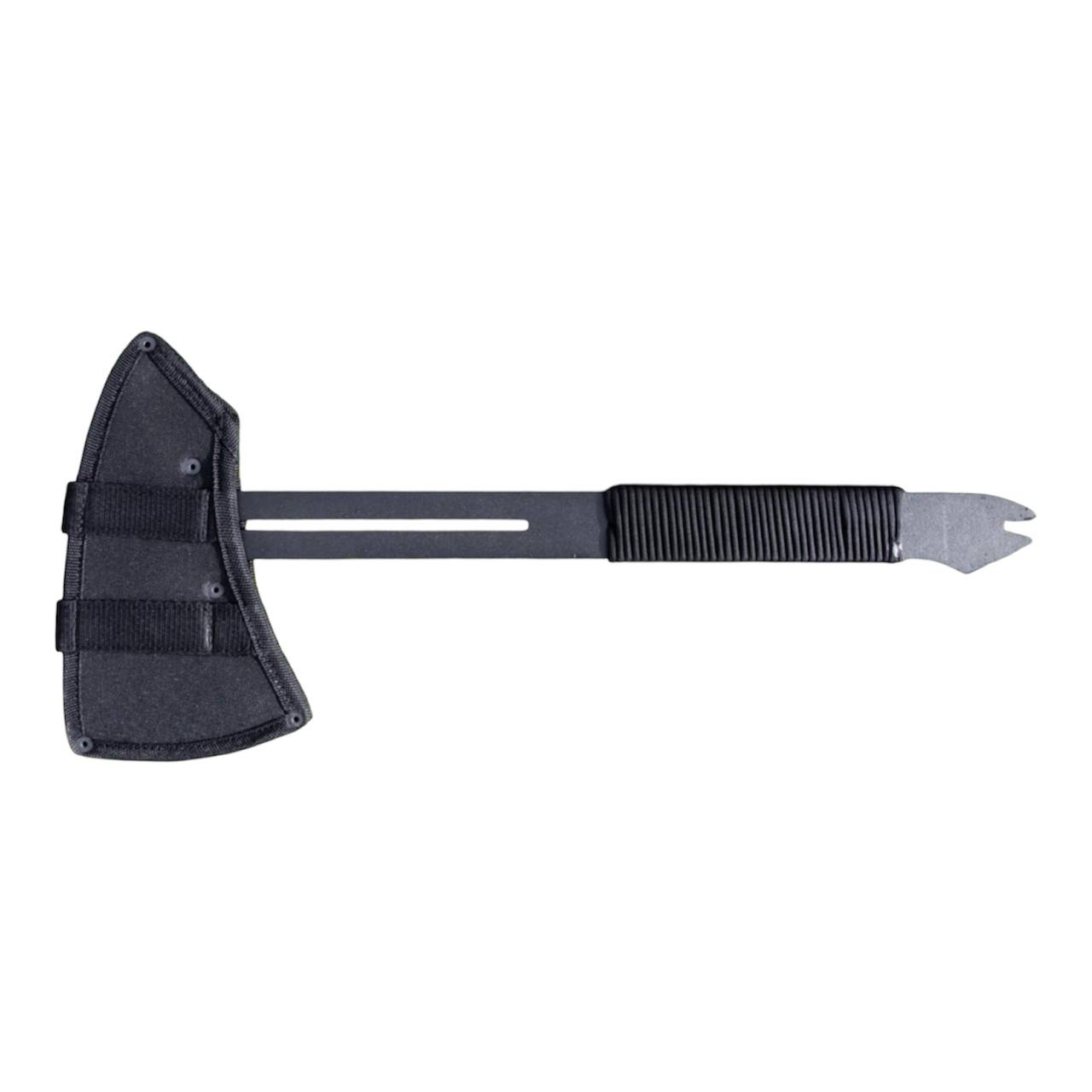 Сокира ВОЇН — компактна тактична сокира з суцільнометалевою конструкцією, виготовлена зі сталі 66Mn4 товщиною 5 мм та загартована до 55 HRC. Інструмент поєднує рубаючу сокиру, цвяхознімач і допоміжний гак на обуху, що робить її універсальним інструментом для туризму, кемпінгу та польових робіт. Руків’я обмотане паракордом, а для транспортування передбачено нейлоновий чохол з системою MOLLE.