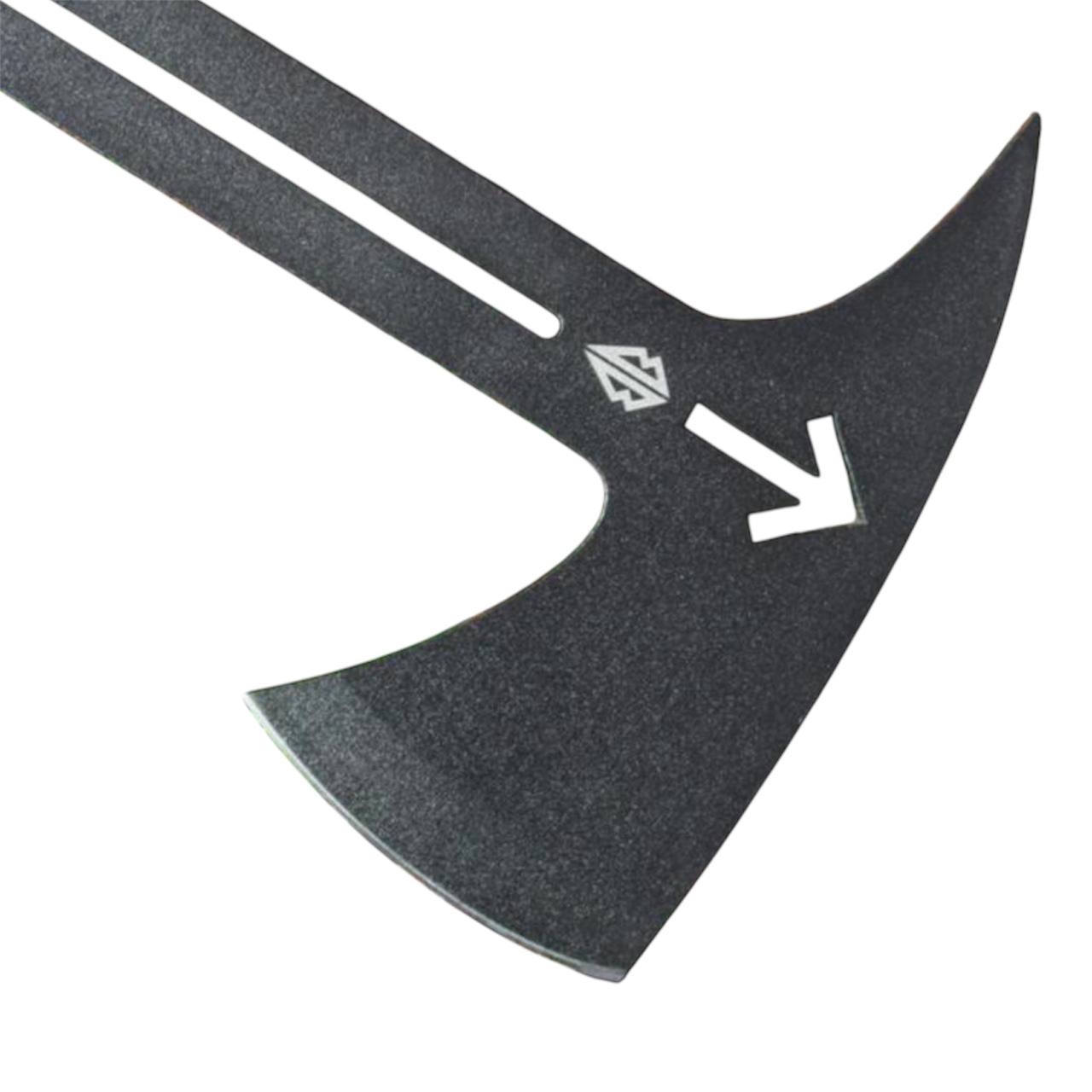 Сокира має суцільнометалеву конструкцію, виготовлену з високовуглецевої сталі 66Mn4 товщиною 5 мм. Матеріал загартований до твердості 55 HRC та покритий чорним антикорозійним полімерним покриттям.