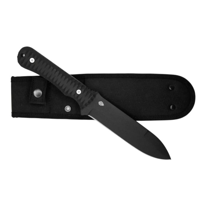 Армійський ніж ПІХОТА — великий польовий ніж для важких робіт та використання в екстремальних умовах. Клинок зі сталі 1.4116 товщиною 5 мм, загартований до 57 HRC, забезпечує міцність і довге утримання заточки. Ніж має суцільнометалеву конструкцію Full Tang, ергономічне руків’я з ABS-пластику та комплектується нейлоновим чохлом із системою MOLLE.